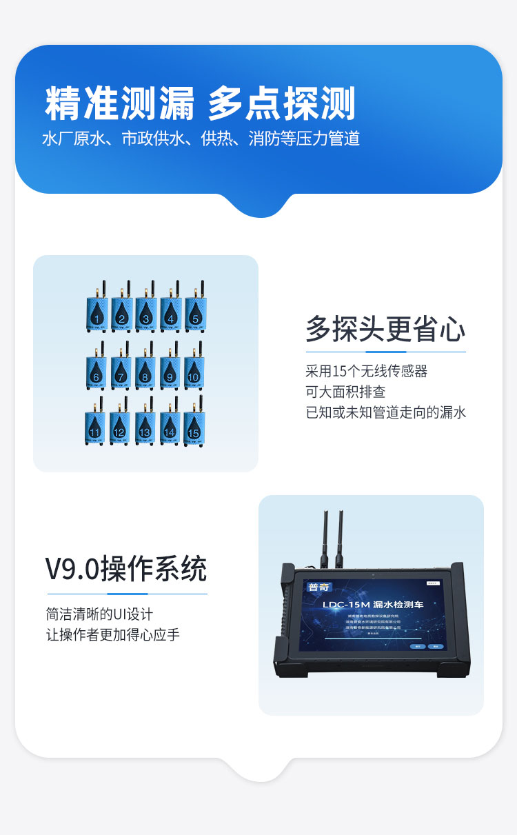 普奇 PQ-LDC-15M漏水檢測車,是我院新研發(fā)的一款高精度、高效率的壓力管網(wǎng)降損查漏的、測漏水精準定位儀器設備,主要用于在已知或未知管道走向的情況下,大面積快速對??原?、市政供?、供熱、消防等壓?管道進?漏?檢測、漏?點定位和?常巡檢,滿?不同場景不同環(huán)境的作業(yè)。