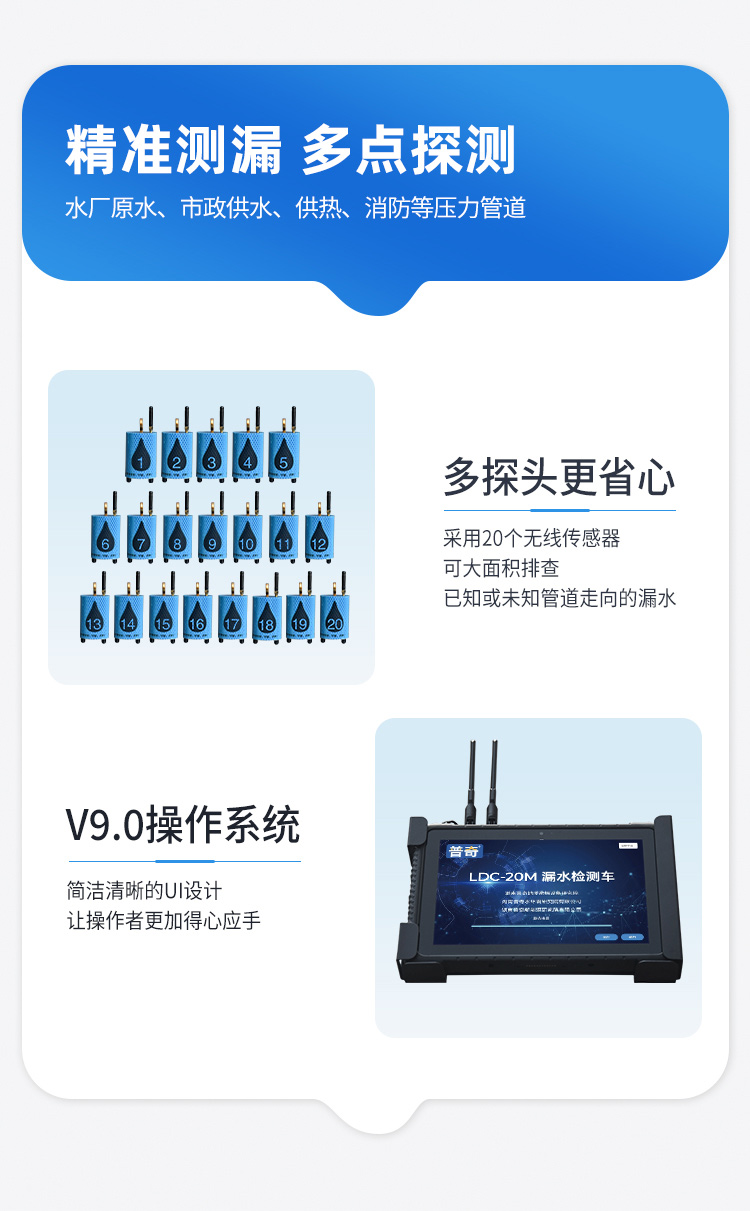 普奇PQ-LDC20M漏水檢測(cè)推?是我院?主研發(fā)具備三位?體?作原理的管道漏?檢測(cè)設(shè)備,該設(shè)備結(jié)合三種不同?作原理,主要運(yùn)?于??積快速對(duì)??原?、市政供?、供熱、消防等壓?管道進(jìn)?漏?檢測(cè)、漏?點(diǎn)定位和?常巡檢,滿?不同場(chǎng)景不同環(huán)境的作業(yè)。