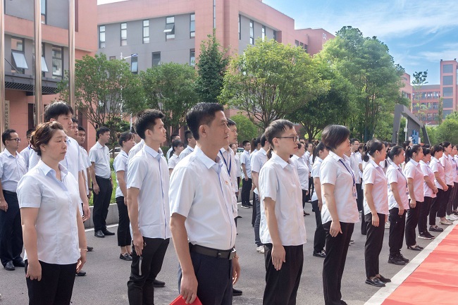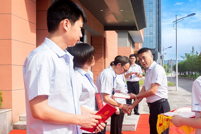 ? ? ? 儀式由副書(shū)記劉瑞峰主持,儀式共分三項(xiàng),第一項(xiàng):升國(guó)旗;伴隨著雄壯的國(guó)歌聲,五星紅旗冉冉升起,迎風(fēng)飄揚(yáng),全體人員莊嚴(yán)肅立,高唱國(guó)歌,向國(guó)旗行注目禮,表達(dá)了對(duì)偉大祖國(guó)無(wú)限熱愛(ài)之情。儀式第二項(xiàng):為微宣講獲獎(jiǎng)人員頒獎(jiǎng);我院執(zhí)行院長(zhǎng)陳震分別為獲得一、二、三等獎(jiǎng)的同志和優(yōu)勝獎(jiǎng)獲得者頒發(fā)榮譽(yù)證書(shū)和獎(jiǎng)金并合影留念。儀式第三項(xiàng):書(shū)記、院長(zhǎng)陳波為本次儀式致辭;陳波書(shū)記先是對(duì)辛勤工作和無(wú)私奉獻(xiàn)的全體普奇人表示了由衷的感謝,接著重溫了黨和單位的發(fā)展歷程,表示在全體普奇人的共同努力下,使單位取得了較好的經(jīng)濟(jì)效益和社會(huì)效益。希望全體普奇人團(tuán)結(jié)一心,真抓實(shí)干,把濃濃的愛(ài)國(guó)情懷轉(zhuǎn)化為實(shí)際行動(dòng),心無(wú)旁騖謀發(fā)展,只爭(zhēng)朝夕抓落實(shí)。為實(shí)現(xiàn)單位既定的發(fā)展戰(zhàn)略?標(biāo),再創(chuàng)普奇新的輝煌?努?奮?。最后,全體黨員前往普奇三號(hào)棟黨建大廳進(jìn)行重溫入黨誓詞活動(dòng);至此,本次“喜迎二十大,奮進(jìn)新征程”暨向建黨101周年獻(xiàn)禮系列活動(dòng)圓滿結(jié)束。