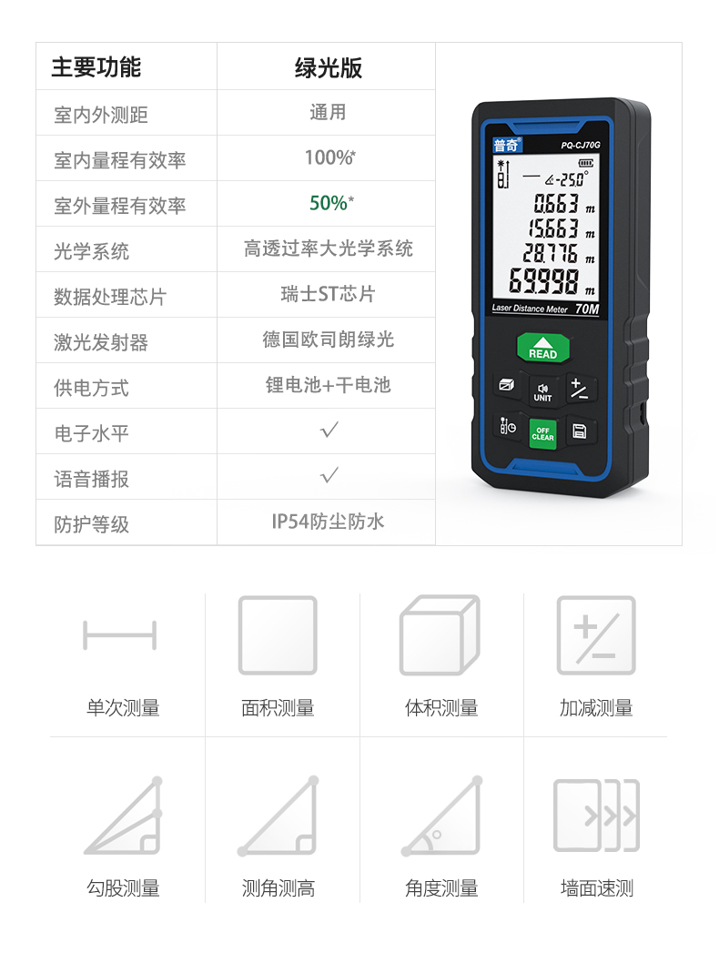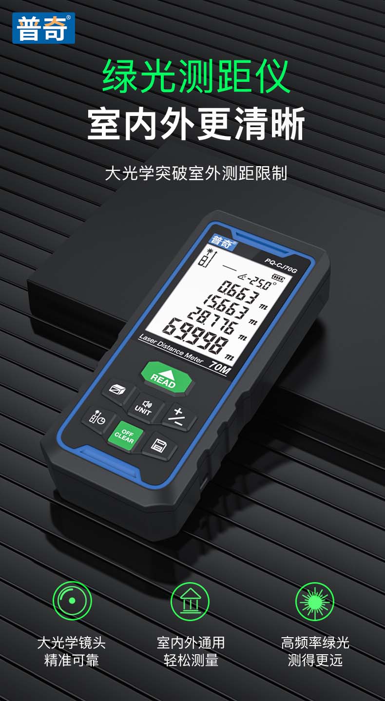 普奇 CJ70G 測距儀,搭載先進(jìn)激光測量技術(shù),測量快速精準(zhǔn),誤差小。具備大屏顯示、操作簡便等特點(diǎn),適用于裝修、工程測繪、家居設(shè)計等場景,滿足多樣化距離測量需求,是專業(yè)人士與家庭用戶的理想測量工具。