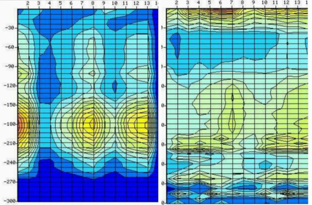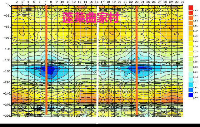 為探求剖面圖與實(shí)打出水量不符合的原因,我們又平移4m測(cè)了一條與上面的測(cè)線平行的測(cè)線,各測(cè)點(diǎn)完全對(duì)應(yīng)(見(jiàn)圖二)。