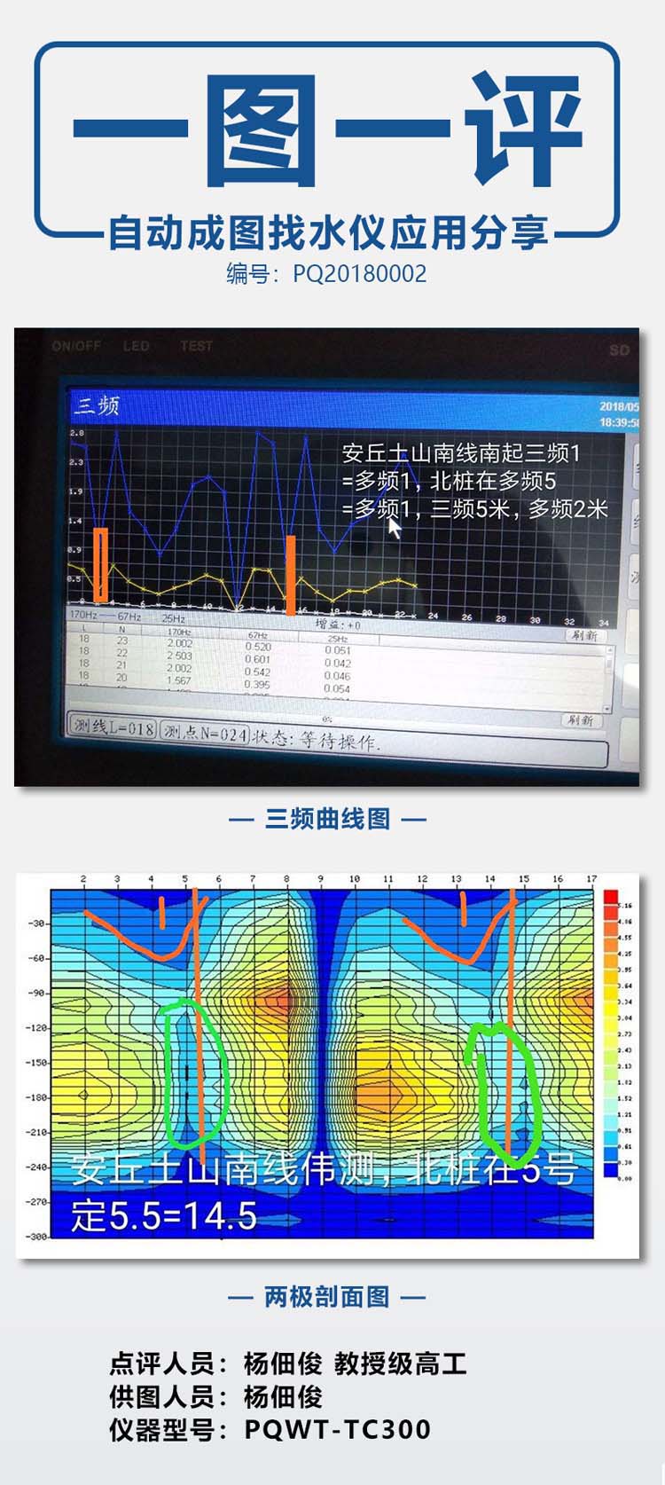 這是在灰?guī)r出露的大斷層的實測圖。三頻12為空測,向右是復(fù)測,3=15點正對對層,反映明顯。多頻9點空測,向右復(fù)測,4=13點正對斷層,一致性好。預(yù)計靜水位60米,5點6點對應(yīng)14點15點,100米以下有明顯低值反映,反應(yīng)程度大大強于單純的低值下傳,應(yīng)是裂隙好的表現(xiàn)。實打在5.5=14.5點,到47米就因跑風(fēng)嚴(yán)重被迫停鉆。證明天電可以找出好斷層。