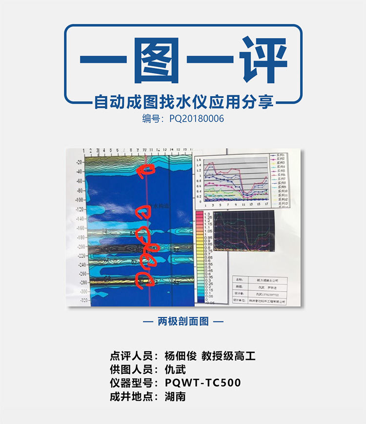該圖屬于“水平多層,水量濤濤”圖形。圖中標出了5層有黑邊的水平高值層,各測點都有顯示,呈電性差異很明顯的高低值互層,分析認為各層的接觸面都有水,打哪個點都行。為爭取水量更好,我選擇了高低值差異更明顯的10號點。經(jīng)實打,39米見水,到220米水量已達200方/天,大獲成功。