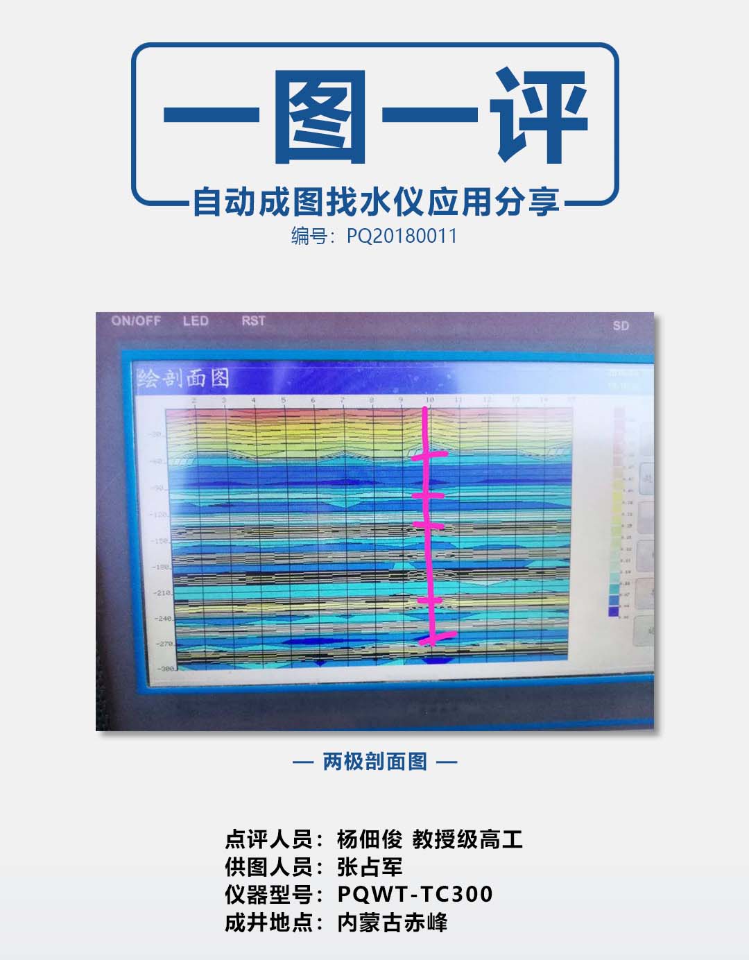 又是一個“水平多層,水量不少”的典型。在泥巖中找水要找硬層,硬層越多越硬越好,它往往表現(xiàn)為在深藍色的背景中有幾層黑色水平條帶。該圖的10號點并無明顯的異常,但下面有多層硬巖反映,供圖人在咨詢時我們提出,該圖哪個點都有水,打的越深水越多。實打60米見水,在100,130,237,270米水量都越來越大,經(jīng)受住了實踐的檢驗。
